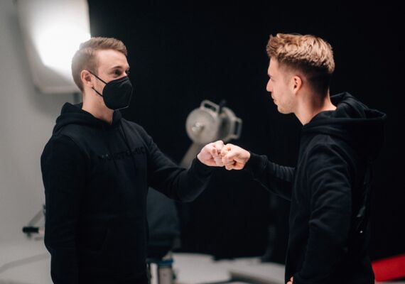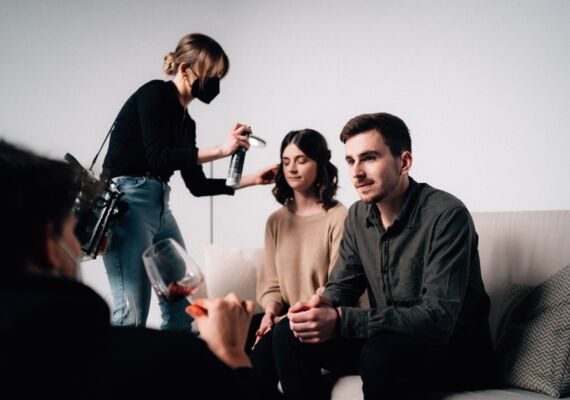 Unsere erste Wahl für den Drehort: Die hangar-Studios in Berlin-Adlershof. 500 m2 Studiofläche, eine große Hohlkehle und tipptopp Ausstattung - z.B., um Dolly-Schienen für Kamerafahrten zu verlegen. Denn davon brauchten wir gleich zwei, um alle Einstellungen aus dem Skript drehen zu können. Bereits am Tag vor den eigentlichen Dreharbeiten, wurde es ernst für uns: Gemeinsam mit unseren Kollegen von FORTSCHRITTE FILM aus Leipzig, die uns bei der Produktion unterstützt haben, sind wir mit zwei vollbeladenen Sprintern nach Berlin aufgebrochen, um schon mal sämtliche Requisiten (allen voran das Sofa!) und die umfangreiche Lichttechnik vor Ort "in Stellung zu bringen". Das war Schwerstarbeit! Hat aber im Team super funktioniert und wir hatten viel Spaß dabei. Corona-regelkonform versteht sich, denn auch darauf galt es natürlich zu achten. So bestand vor Ort während unseres gesamten Aufenthalts ein striktes Hygienekonzept für alle Beteiligten. Zu denen gesellten sich dann am Drehtag auch noch das restliche Produktionsteam, inkl. Makeup-Artists und unsere fünf Schaupielerinnen und Schauspieler nebst Hund. Da war ganz schön was los am Set!