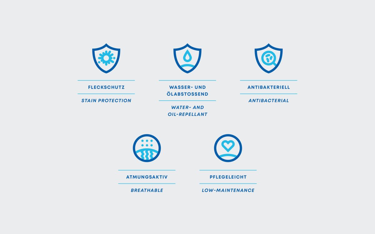 Die entwickelte Wort-Bild-Marke greift diesen Anspruch auf und signalisiert deutlich den Fokus auf kompromisslose Qualität in Form und Funktion. Hier treffen textile und organische Formen auf lebendige Farben und gezielte typografische Statements. Dabei wurde das historisch gewachsene Produktmerkmal der „Unfleckbarkeit“ direkt in die Bildmarke implementiert und transportiert bereits im Logo eines der Kernattribute der Textilmarke.