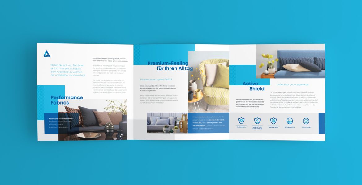 Ein großer Bestandteil der Markenstrategie von Active Line ist die schnelle und einfache Wahrnehmung der Alleinstellungsmerkmale (USP) durch den potentiellen Kunden. Mit einem individuellen Iconset werden diese Informationen in möglichst leicht verständlicher und optisch ansprechender Weise transportiert und bieten damit eine flexible und dynamische Lösung in der Kundenansprache. Auf Erweiterungen in der Produktspezifikation kann somit schnell reagiert werden, ohne das Gesamtkonzept aufzuweichen. Eingebunden in ein modernes, rastergestütztes Layout entsteht ein zeitloses Erscheinungsbild, welches durch seine Modularität allen Anforderungen eines crossmedialen Einsatzes gerecht wird.