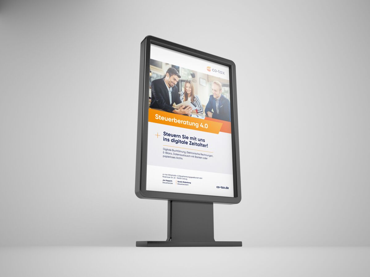 Als innovative, reaktionsschnelle Wirtschafts- und Steuerberatungsgesellschaft hat sich die co-tax bereits erfolgreich in Coburg etabliert. Gut ausgebildete Mitarbeiter mit modernen Arbeits- und Kommunikationsmitteln sorgen für ein sehr gutes Verhältnis zu den Mandaten. Diese schätzen die Reaktionsschnelligkeit und die besonders hohe Aktualität der Kanzlei. Um die Markenwahrnehmung regional weiter zu stärken, soll der Unternehmensauftritt modernisiert werden. Ein zeitgeistiges Farbkonzept und ein einprägsames Signet sollen die moderne Ausrichtung des Unternehmens und den Fokus auf die Digitalisierung unterstreichen.