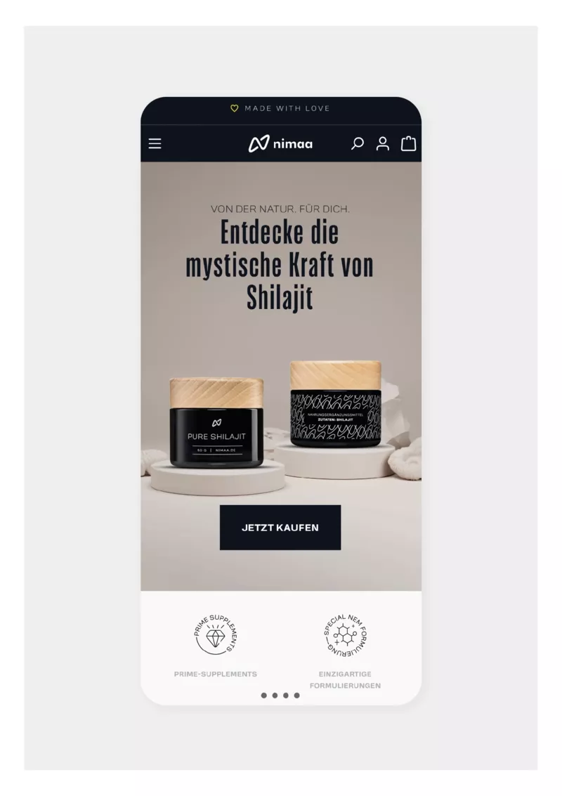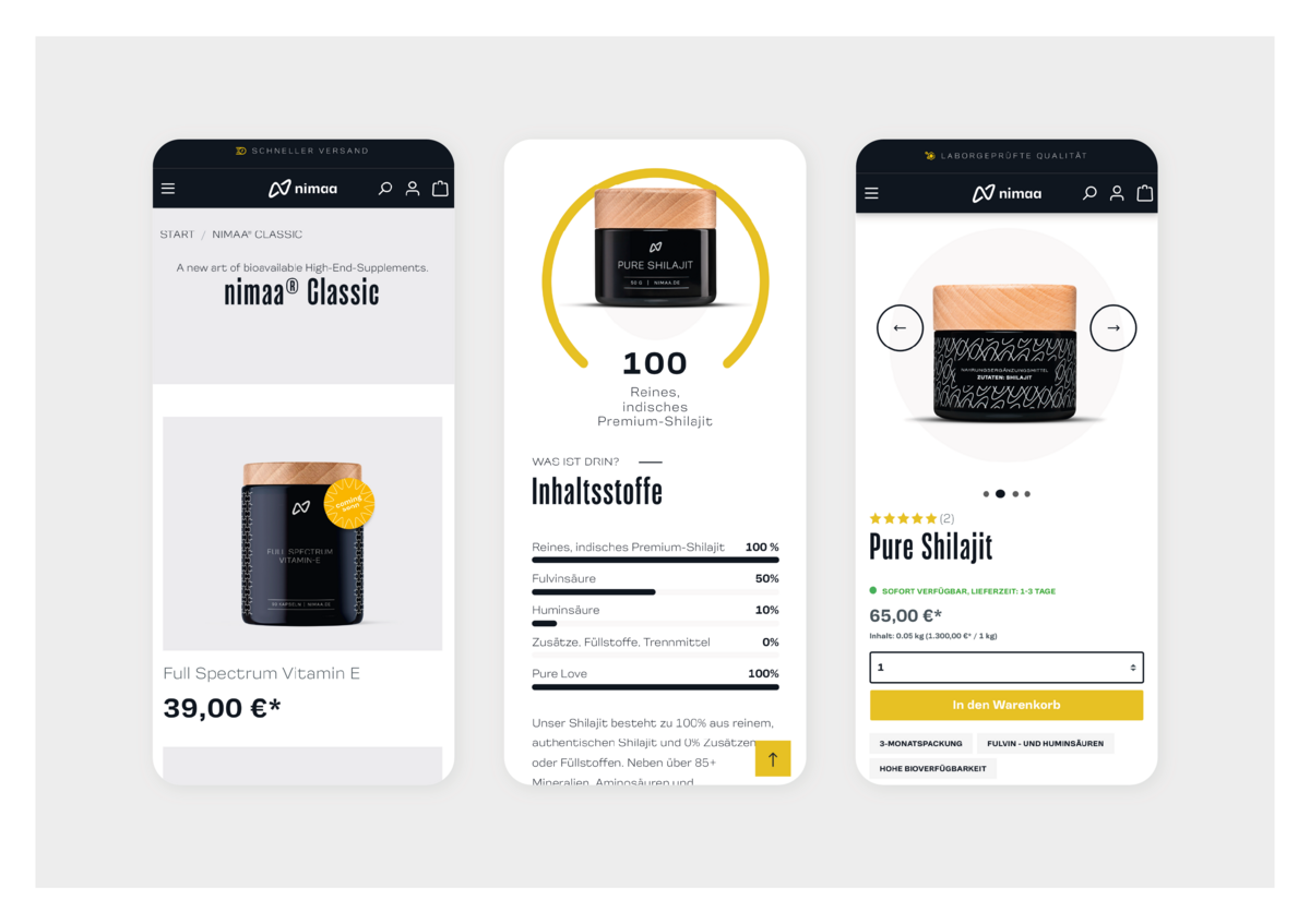 Der nimaa® Shopware 6 Shop ist ein Meisterwerk der Conversion-Optimierung. Wir haben eigene Gestaltungs- und Inhaltselemente entwickelt, die perfekt auf das Branding abgestimmt sind. Der Produktzusammensetzungsslider und die ausführlichen Produktdetailseiten bieten den Kunden ein umfassendes und informatives Einkaufserlebnis.