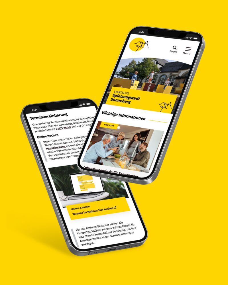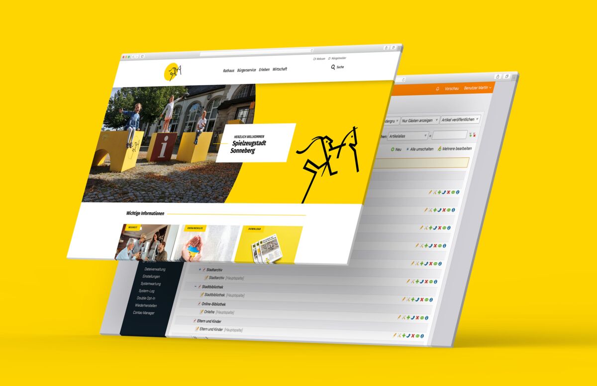 Diese Anforderungen mit einem ansprechenden Design zu verbinden ist eine große Herausforderung. Deshalb verfügen Websites in diesem Bereich meist nur über einfache Standard-Layouts. Unser Anspruch bei sonneberg.de war, den Charakter der Stadt und ihres Corporate Design in Verbindung mit den technischen Anforderungen umzusetzen.