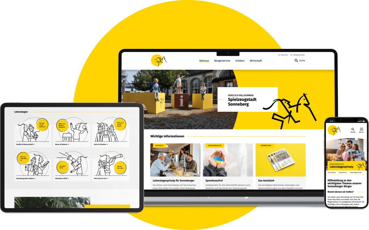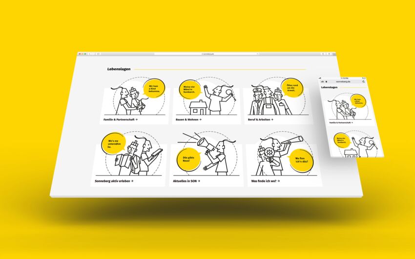 Eine Besonderheit sind stilisierte Illustrationen, entwickelt aus der Formsprache des Logos der Stadt Sonneberg und des Sonneberger Reiterleins. So ergibt sich ein hoch individueller Illustrationsstil, der den Charakter der bisherigen Gestaltungselemente der Stadt hervorragend aufgreift. Diese Illustrationen finden im Konzept der "Lebenslagen" Anwendung.
